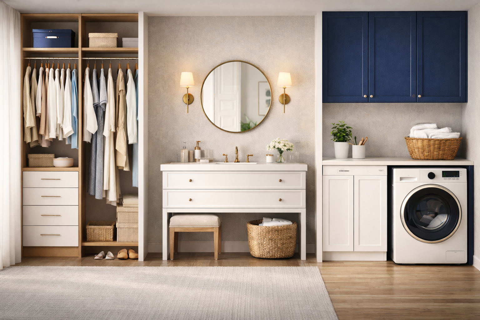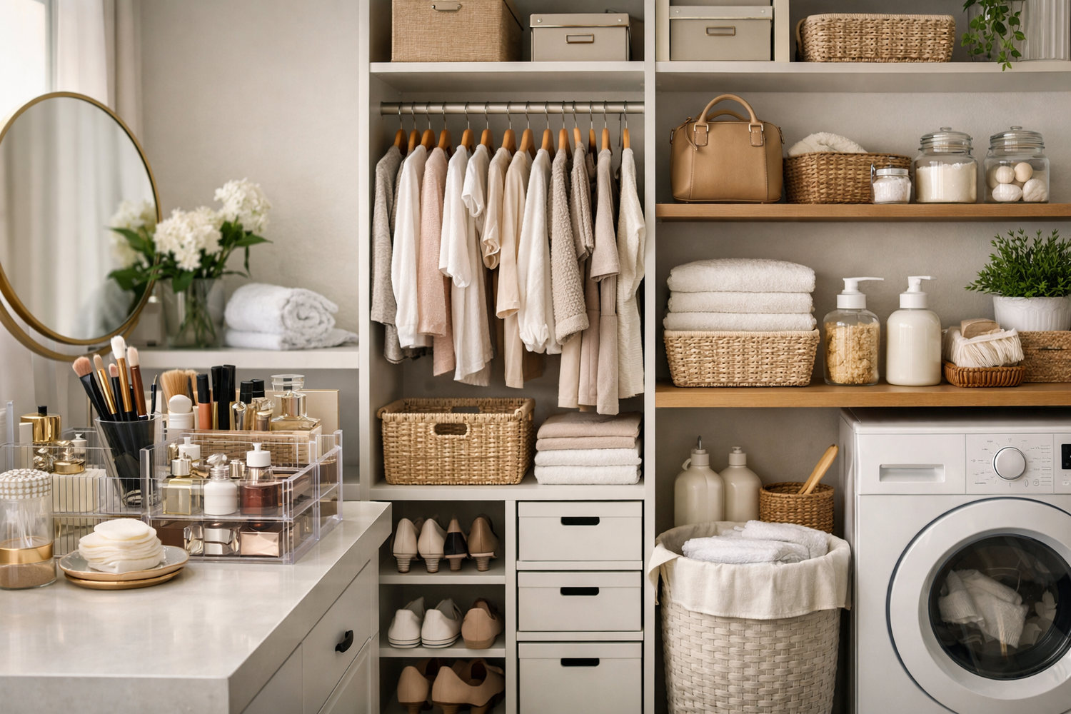 Functional organization for vanity, closet, and laundry spaces designed to simplify everyday living.