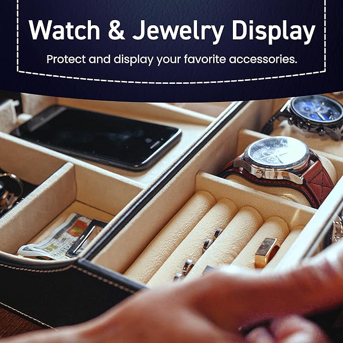 - Extra Large Watch Slots - are 60mm wide to store oversize watches that have large faces (50mm & Over); the jewelry box for men also features a front catch-all tray that's curved which makes it easy to scoop out coins and keys.