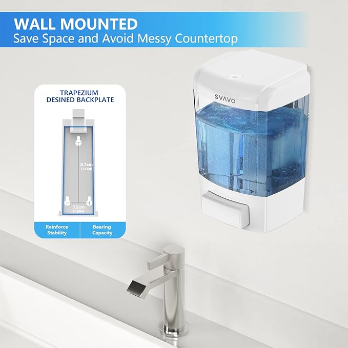 - π β [SPACE SAVING DESIGN] The hand soap dispenser is created with wall mounted concept that helps save space to dispsense hand soap allodially even in the case of confined space. This wall mount soap dispenser is a hygienic solution to all the clutter of bottles on your shower floor, shower shelf, kitchen sink, washing basin.