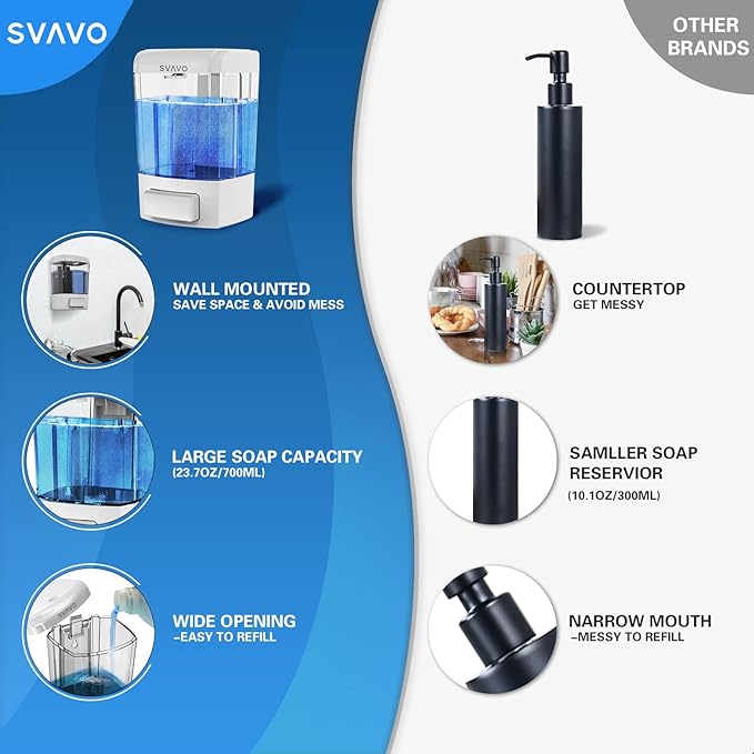 - πβ [QUALITY MANUAL SOAP DISPENSER] SVAVO's liquid soap dispenser is made of durable ABS, resistant to chemicals and impact, sturdy and durable, does not rust, providing long-lasting strength with simple and precise push button dispensing.