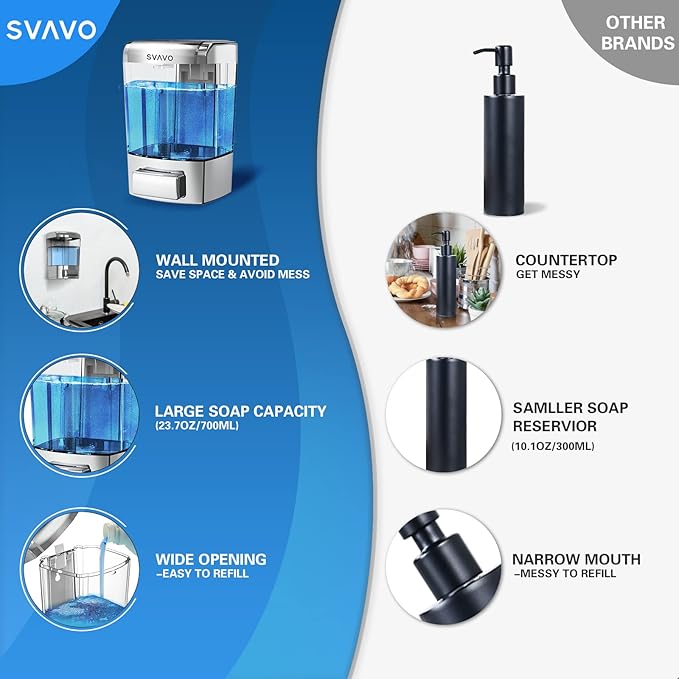 - πβ [QUALITY MANUAL SOAP DISPENSER] SVAVO's liquid soap dispenser is made of durable ABS, resistant to chemicals and impact, sturdy and durable, does not rust, providing long-lasting strength with simple and precise push button dispensing.