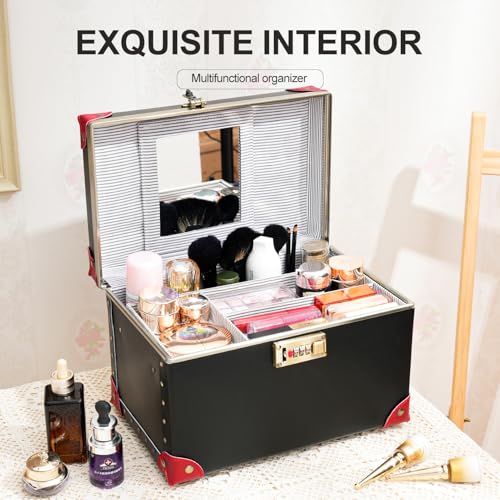 urecity Vintage Makeup Train Case, Black Artificial Leather with Red Trim, Professional Cosmetic Organizer with Metal Combination Lock, Multi-Layer Storage Box