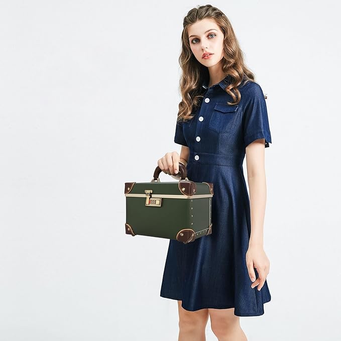 - VINTAGE DESIGN: Classic retro-style makeup train case crafted with premium artificial leather in elegant dark green with brown leather accents and decorative stitching