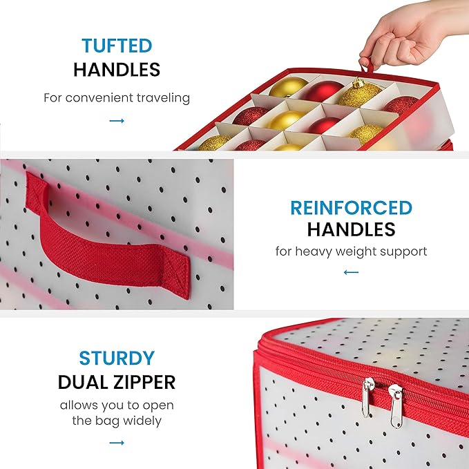 - FESTIVE HOLIDAY BLISS - Prepare for joy and merriment with the cheery Christmas colors of this organizer. It adds a delightful pop of excitement and sophistication to your ornament storage. With lively hues that capture the spirit of the season, it transforms the task of packing up the holidays into a pleasurable and joyful experience.