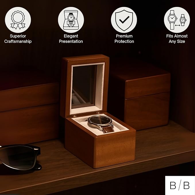 - Single Watch Display Case: This compact Viscount watch box gives one special timepiece its own elevated stage with a warm, furniture-style finish and a clear viewing lid. The upright silhouette feels more like a miniature display case than basic storage, ideal for a dresser, shelf or desk. It keeps your chosen watch front and center instead of lost among everyday clutter.