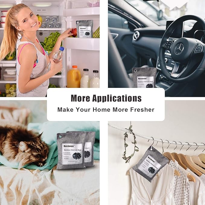 - Bamboo Charcoal Bags : Each bag has metal hanging ring and sealed inside a breathable linen bag that can work anytime and anywhere. According to the degree of smell, the amount of air freshener bags can be appropriately increased to speed up the adsorption rate and quickly eliminate odor and smoke. For example, the adsorption rate of 150 grams activated bamboo charcoal is four times faster than 50 grams. With the different packs to meet all your needs for purifying.