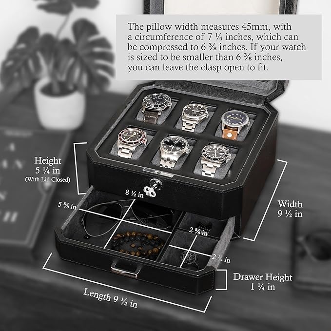 - 6 LARGE WATCH COMPARTMENTS: Each cushion holds a small or large watch neatly in place, up to 60mm next to each other. There is plenty of space between the lid and cushions to accommodate watches of all size. Rothwell watch boxes are perfect gifts for Father’s Day, Mother's Day, birthdays, anniversaries, Valentine's day, graduations, holidays, retirement, and corporate events.