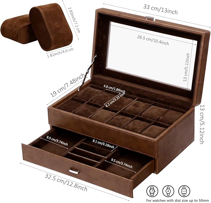 - [2-Layer]: This watch display case has 2-layer, The first layer offers 12-slots with removable watch pillows, the bottom drawer provides mens jewelry box, 1 ring case, 2 study earring cards, 2 more jewelry trays for necklaces, bracelets, cufflinks, wallets, keys, business cards, brooches and other jewelry accessories