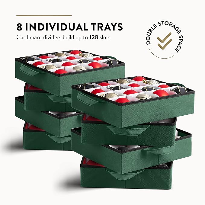 ZOBER Christmas Ornament Storage Box - Stores 128 3" Ornaments with Individual Trays - Tear Proof 600D Oxford Fabric - ornament organizer storage box, Durable Christmas Containers Holder - Green