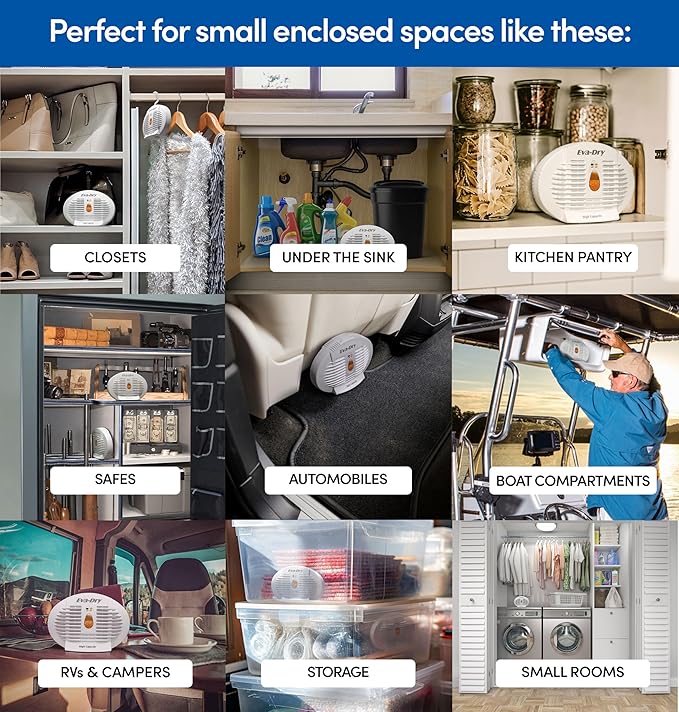 - DEHUMIDIFIER CLOSET: This compact, portable dehumidifier is perfect for closets. It helps prevent excess humidity, keeping your clothes, shoes, and accessories dry and fresh without the need for refills or batteries.