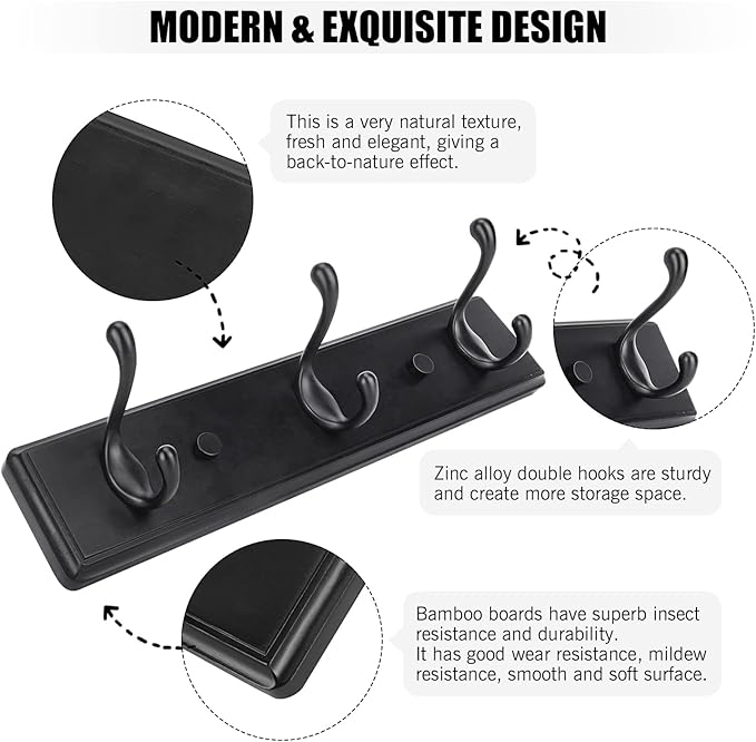 Wooden Coat Rack, Wall-Mounted Organizer for Closet, Entryway, Hallway, Foyer, Bedroom, Heavy Duty Double Hooks for Hanging Towels, Bags, Hats, Jackets, Key (Black, 3 Hooks)