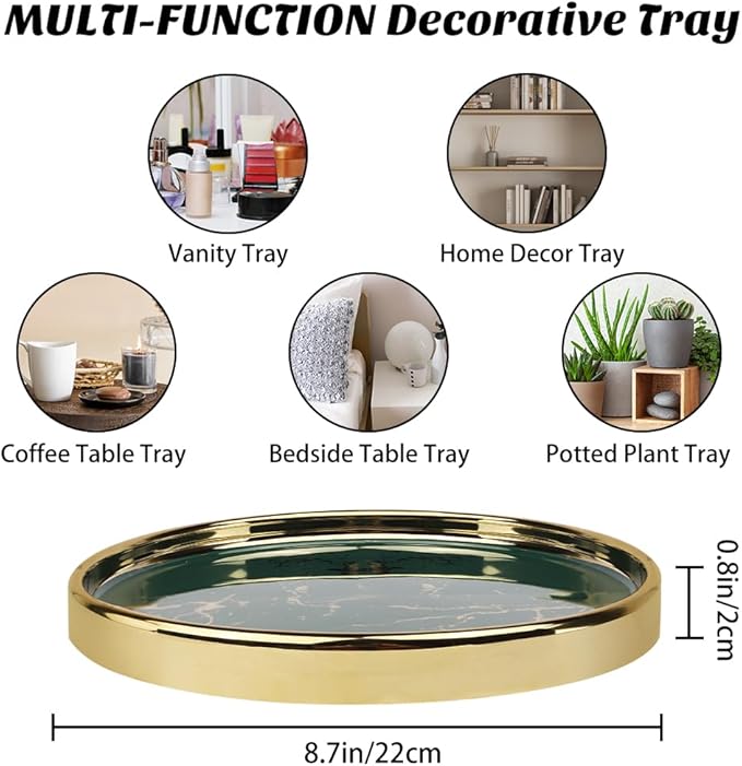 - [ELEGANT & FUNCTIONAL]: Place the round decorative tray on your dresser, nightstand, table and desks, etc. It is a pretty ornaments for home decor. Also be a ornate decorative dresser makeup tray used on Vanity, Dresser, Bathroom, Bedroom. It holds your items without taking up too much space on your dresser. The smooth edges hold everything in a steady manner.