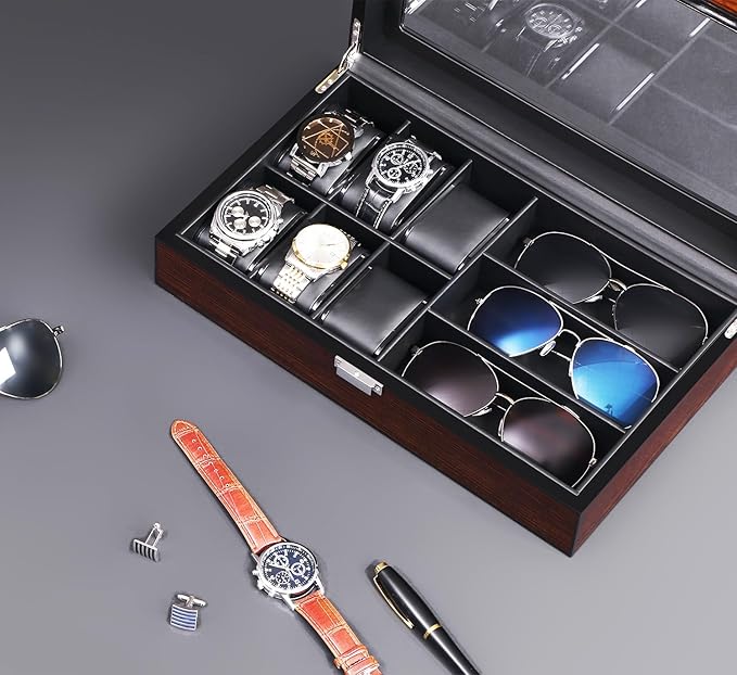 - 【Exquisite Craftsmanship】: The watch organizer is made of MDF, Interior is covered with smooth faux leather, watch pillow with PS material and sponge cushions, unique beauty while protect watches and sunglasses from scratching. suitable for personal or business use and great for shop window watch displaying