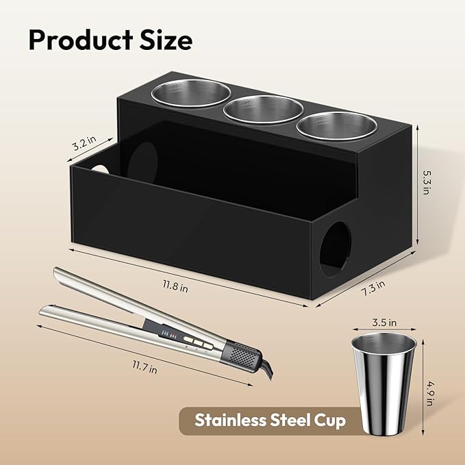 - SAFE HOT TOOLS HOLDER - 3 STEEL CUPS -We understand your concerns about the storage of thermal tools. The NIUBEE hair product organizer is equipped with 3 stainless steel cups, which can be used as hot iron, curler holder and hair straightener holder, providing a safe place to quickly cool these hair tools and store them safely without worrying about melting other bathrooms Accessories.