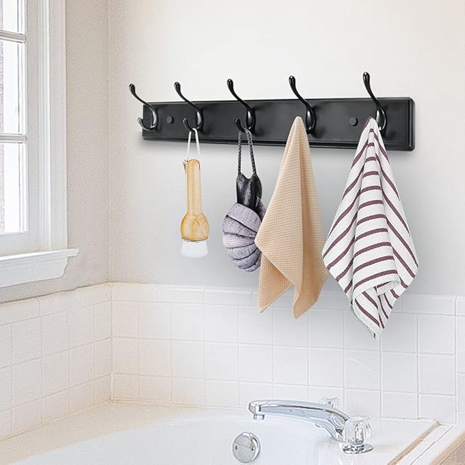 Wooden Coat Rack, Wall-Mounted Organizer for Closet, Entryway, Hallway, Foyer, Bedroom, Heavy Duty Double Hooks for Hanging Towels, Bags, Hats, Jackets, Key (Black, 5 Hooks)