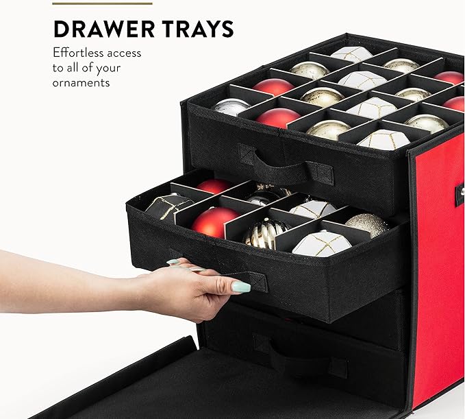 ZOBER Christmas Ornament Storage Box - Stores 64 3" Ornaments with Drawer Style Trays - Tear Proof 600D Oxford Fabric - Ornament Organizer Storage Box, Durable Christmas Containers Holder - Red