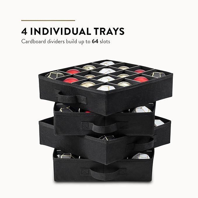 - COMPACT DELIGHT- It's a storage miracle! This organizer works like a box but stores like Santa's bag. With its sturdy freestanding design, supported by trays instead of cardboard inserts, it holds a treasure trove of ornaments while remaining compact.