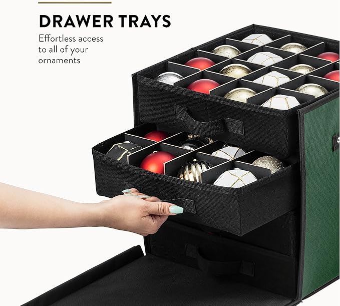 ZOBER Christmas Ornament Storage Box - Stores 64 3" Ornaments with Drawer Style Trays - Tear Proof 600D Oxford Fabric - Ornament Organizer Storage Box, Durable Christmas Containers Holder - Green