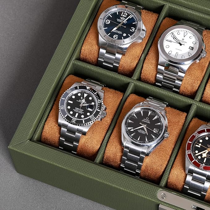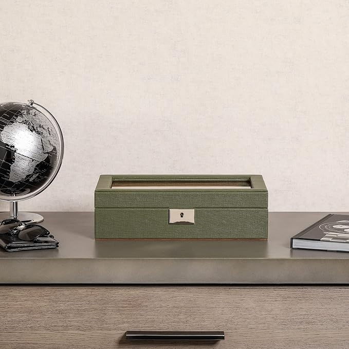 ROTHWELL 10 Slot Leather Watch Box - Luxury Case Display Jewelry Organizer - Locking Watch Display Case Holder with Large Glass Top - Box Organizer for Men and Women (Green/Tan)