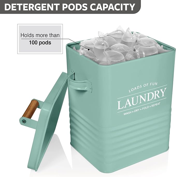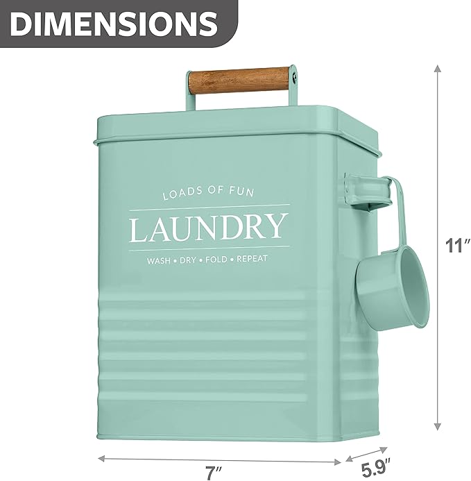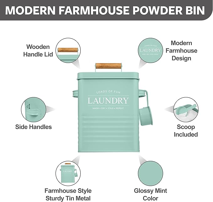 - MODERN FARMHOUSE DESIGN: Modern product design with a word ‘laundry‘ is printed on a farmhouse style laundry powder container with a wooden handle providing modern farmhouse touch to your laundry room. This laundry storage tin’s mint green color will blend seamlessly with any laundry interior scheme and is a wonderful alternative to cardboard laundry detergent boxes