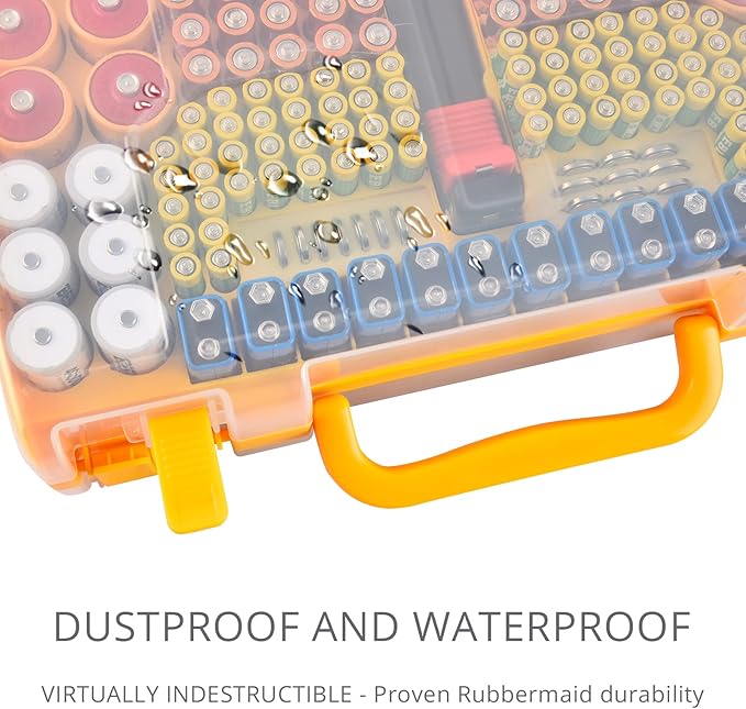 - Well-designed battery drawer organizer - High-quality plastic material, waterproof and shockproof, strong and durable battery rack can effectively bear the weight of full battery. The hinges on the lid is not easy to damage and four tight latches easy to open and close. Smooth Edge of the battery container does not hurt hands.