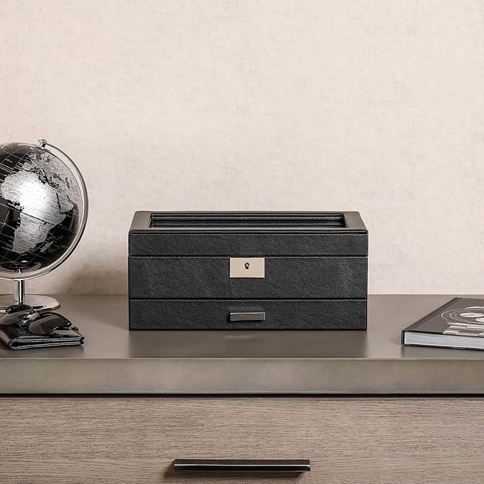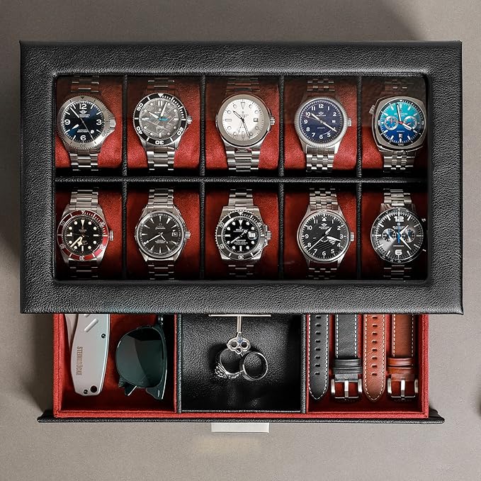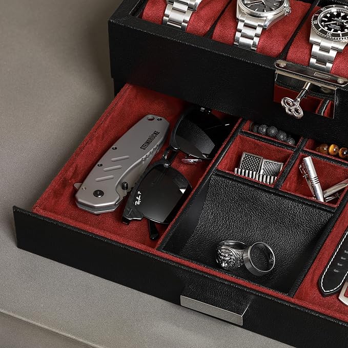 - INCLUDES VALET DRAWER: A slide-out drawer provides the convenience to hold additional items like straps, cufflinks, rings, tie clips, sunglasses, pens, money, cards, or watch tools. Note: We do not recommend using our red interior with white or light colored straps, red coloring may transfer with prolonged storage.