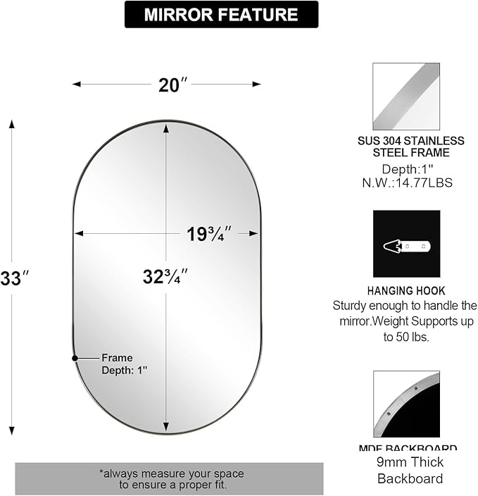 - STAINLESS STEEL METAL MIRROR: Overall:20x33 inch, weighs 14.77lbs! From the weight, you would know how the exceptional quality material we choose for each oval mirror. To let each mirror stand by with time, we use the sleek SUS304 stainless steel frame with oxidation-resistant. 4mm HD glass supported by 9mm MDF backboard is surrounded by the metal frame to be anti-explosion.