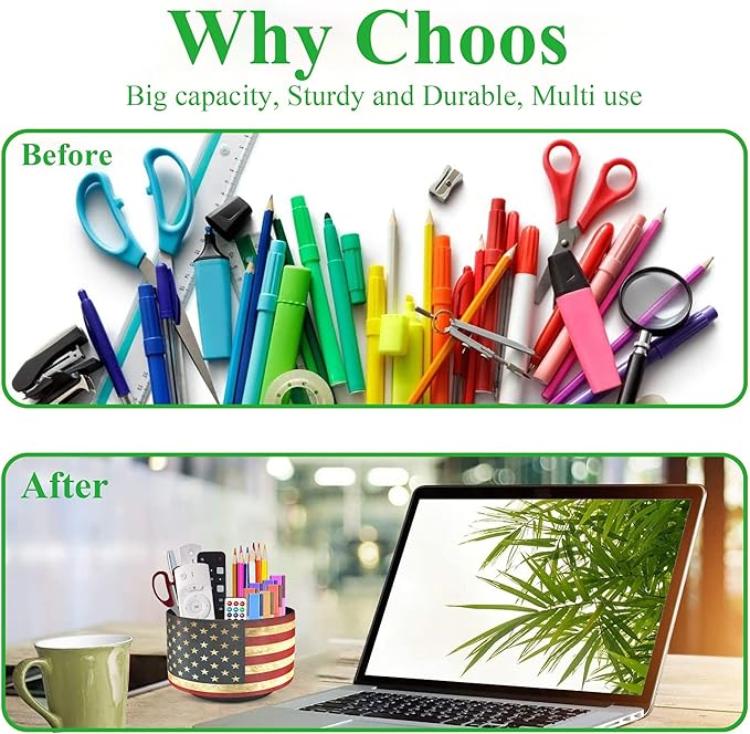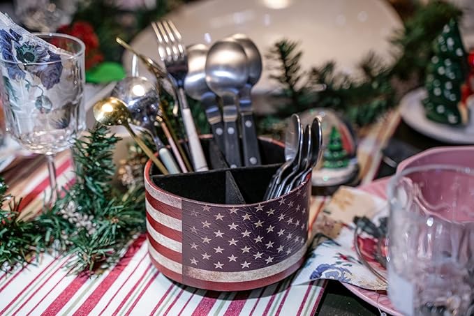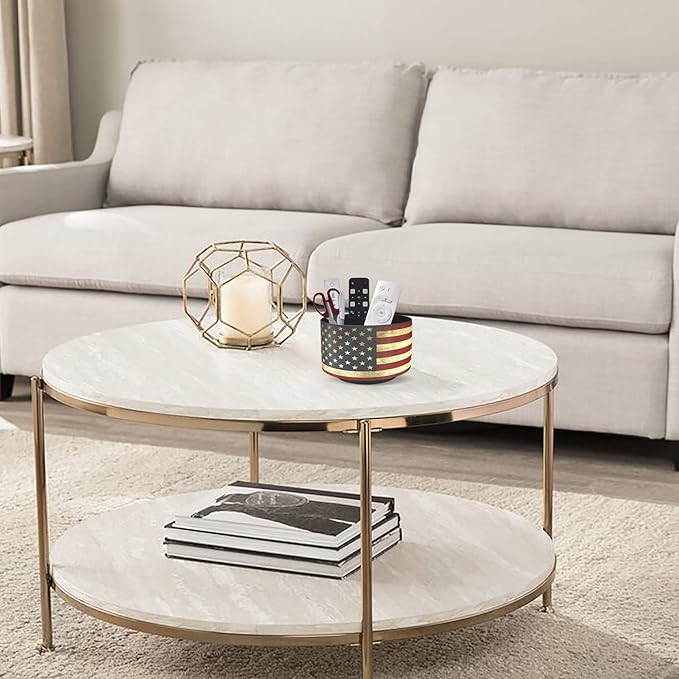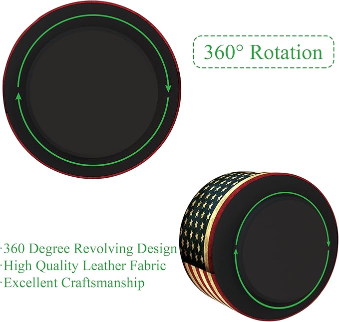 Hennaja Round Leather Art Supply Organizer,Remote Control Holder,360 Degree Rotating,Multi-Functional Pencil Holder,4 Compartments Desktop Stationary Organizer(1-American Flag)