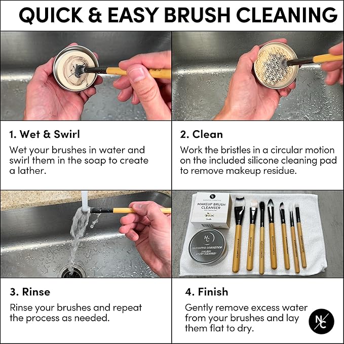 - QUICK & EASY BRUSH CLEANING: Wet your brushes in water and swirl them in the soap to create a lather; Work the bristles in a circular motion on the included silicone cleaning pad to remove makeup residue; Rinse your brushes and repeat the process as needed; Gently remove excess water from your brushes and lay them flat to dry.