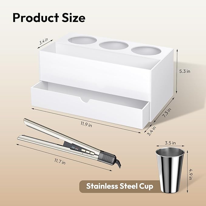 - SAFE HOT TOOLS HOLDER - 3 STEEL CUPS -We understand your concerns about the storage of thermal tools. The NIUBEE hair product organizer is equipped with 3 stainless steel cups, which can be used as hot iron, curler holder and hair straightener holder, providing a safe place to quickly cool these hair tools and store them safely without worrying about melting other bathrooms Accessories.