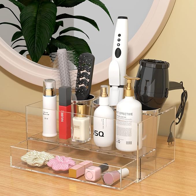 NIUBEE Hair Tool Organizer, Clear Acrylic Hair Dryer and Styling Organizer with Drawer, Bathroom Countertop Blow Dryer Holder, Vanity Caddy Storage Stand for Accessories, Makeup, Toiletries