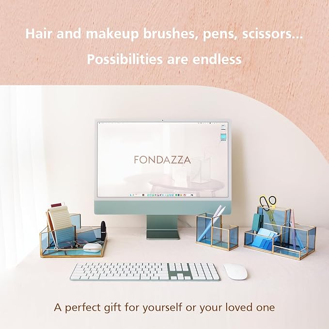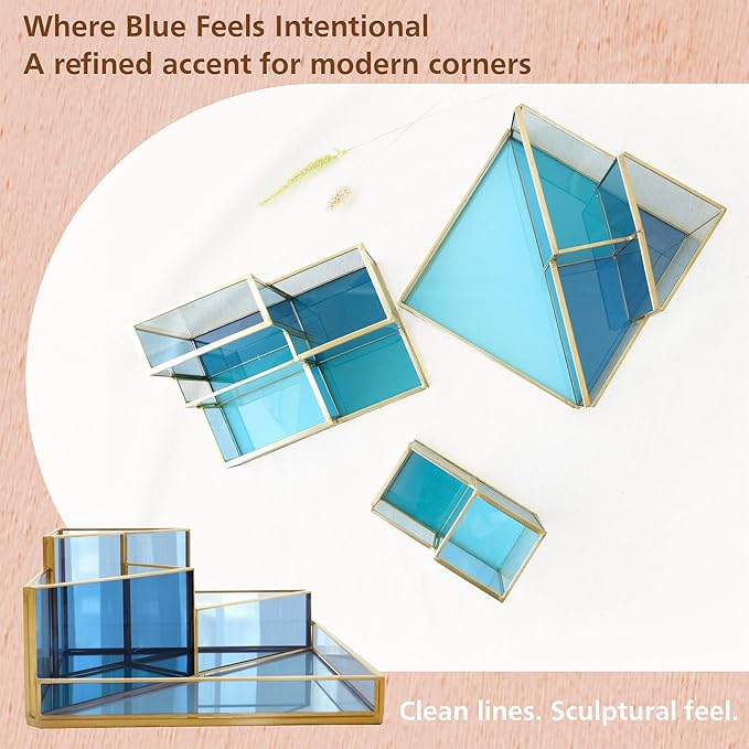 - COLORFUL YET MODERN : A Desk Organizer in sleek geometric shape, combining premium gold brass and layered blue-toned glass to reflect light beautifully—turning your workspace into a vibrant and modern focal point.