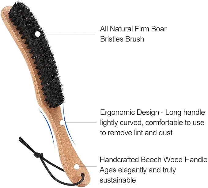 - Solid Beech Wood Handle - The ergonomic wooden handle is expertly crafted, boasting a remarkably smooth edge. These hat brush cowboy hats fit snugly in your hand and feel exceptionally comfortable, thanks to its large handle and curve in the bristled portion that facilitate brushing right up to the edge of the brim. Furthermore, the lint brush for clothes is a gorgeous garment brush that effortlessly removes light dust and pet hairs from your shoulders.