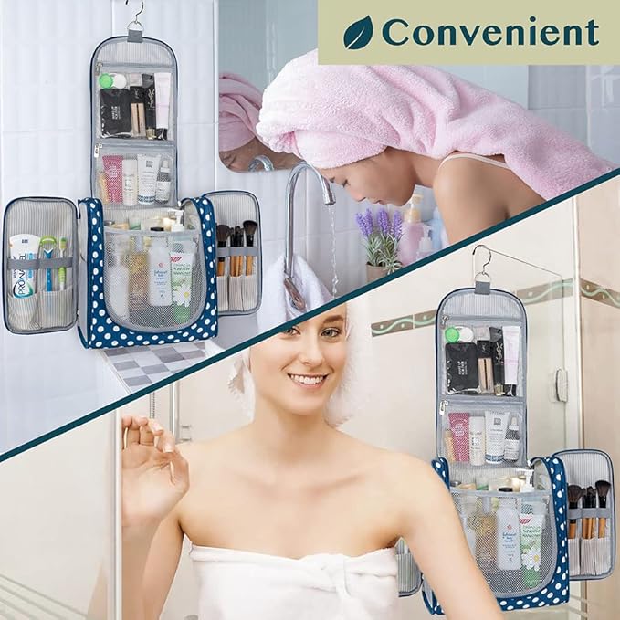 - COSMETICS TRAVEL BAG ORGANIZER: This toiletry bag for women has a hanging hook and multiple pockets that help you stay organizer during business trip, vacation travel. The hanging hook makes it easy to hang the toiletry bag to bars in the hotel shower bathroom. Unzip your toiletry bag to reveal compartments to organize your shampoo, skincare face hygiene products. This toiletry travel bag is an essential accessory for cruise in Europe, plane, Hawaii Trip, and honeymoon.