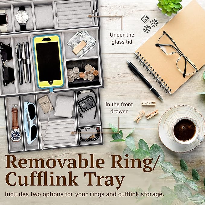 - Convenient Removable Tray - The ring and cufflink tray under the glass lid can be removed or transferred to the front drawer. The Quartermaster also serves as a great mens nightstand organizer and nightstand tray.