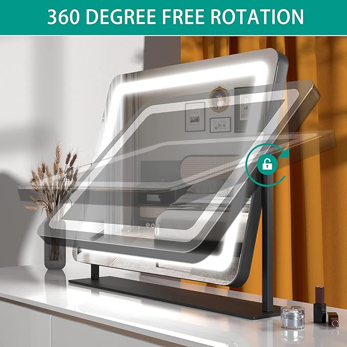 Hasipu Vanity Mirror with Lights, 24.2" x 18.9" LED Make up Mirror, Light up Mirror with 10X Magnification and USB Charging Port, Phone Holder, Smart Touch 3 Colors Dimmable, 360° Rotation (Black)