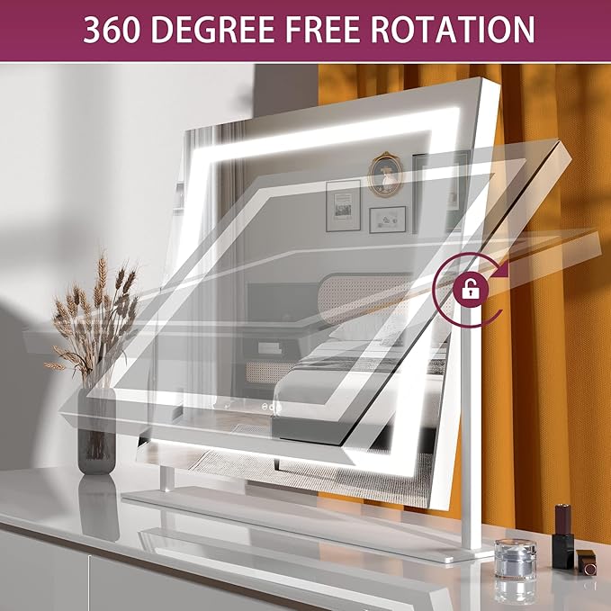 Hasipu Vanity Mirror with Lights, 24.2" x 19.7" LED Makeup Mirror, Light up Mirror with 10X Magnification and USB, Phone Holder, Smart Touch 3 Colors Dimmable, 360° Rotation (Right Angle White)
