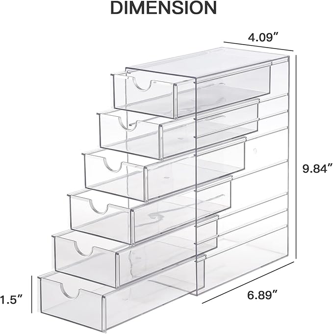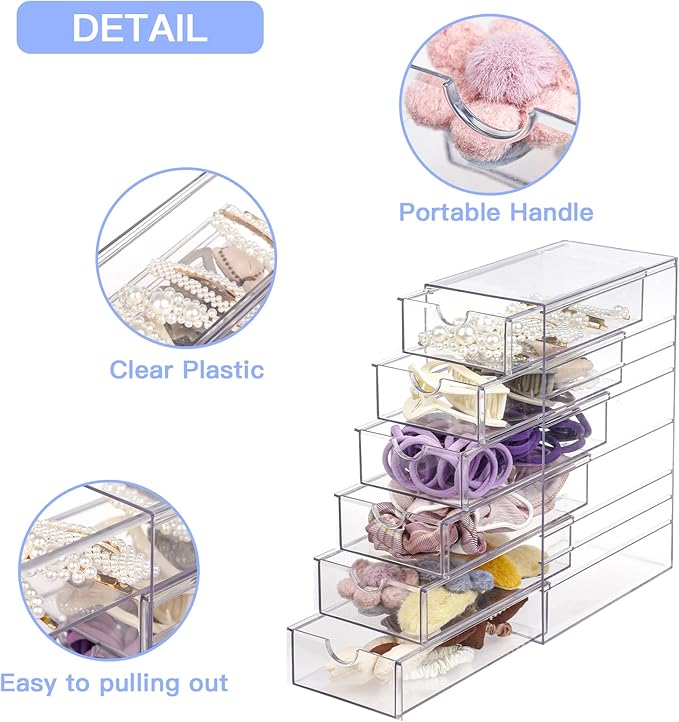 FABROK Clear Hair Accessory Organizer Box with 6 Drawers, Compact Storage Organization Drawers Set for Cosmetics, Glasses, Stationery, Stackable Storage Containers Box for Bathroom, Closet, Office