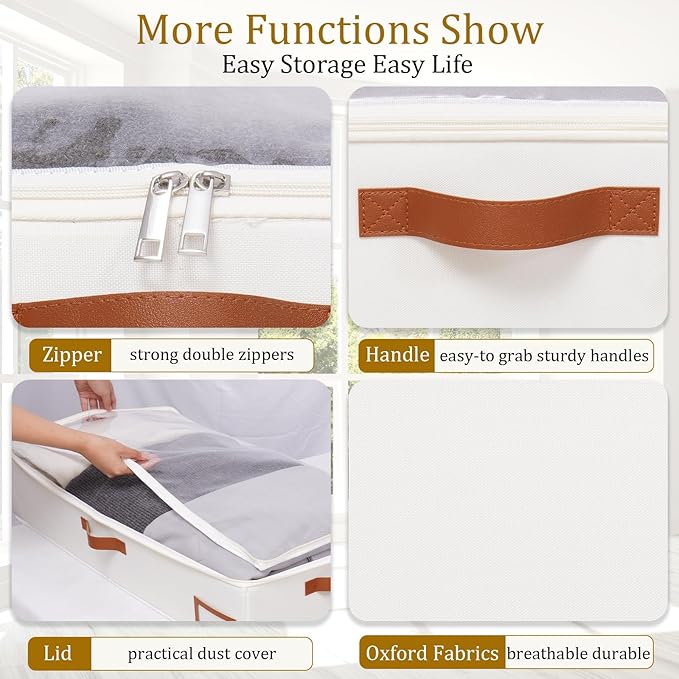 Yawinhe Under Bed Storage Containers, 2 Pack, Bin with Lids, Collapsible Closet Organizers, with Sorting Card Slot and 4 Leather Handles, for Blanket, Bedding, 31.5''Lx15.7''Wx6''H, Beige