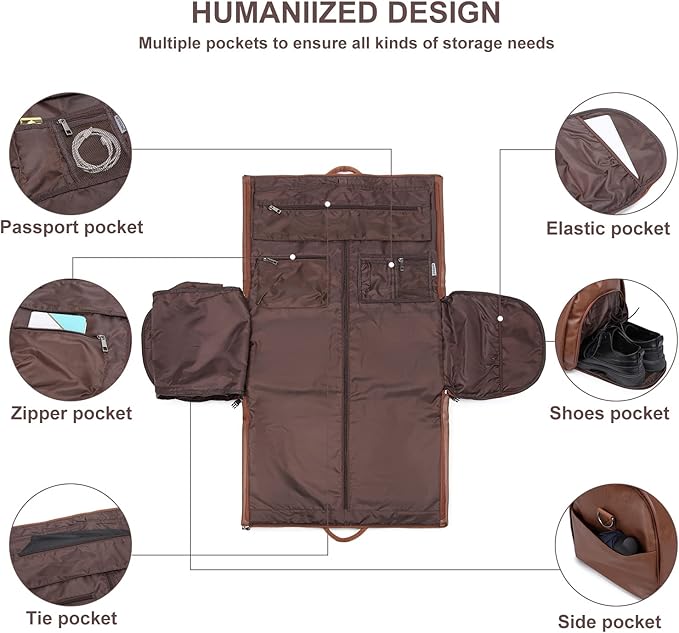 - ✅SUPER MULTI-FUNCTION BAG: The function of hanging clothes bag + various internal pockets (placed with tie, umbrella, wallet, mobile phone, etc.) + large-capacity travel bag, On the side of the leather garment bag, there is a zip pocket accessible for electronics or travel materials.