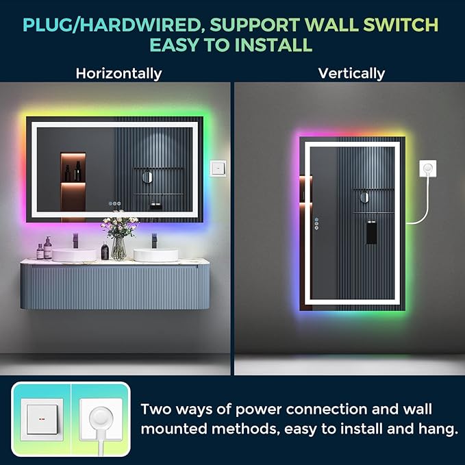 - ✨【Plug/Hard-Wired, Horizontal/ Vertical, Easy to Install】- This bathroom mirror with lights can be powered by a plug or hard-wired. Easy to install, just screw the french cleats to the wall and hang the bathroom mirrors on the french cleats. Can be hung horizontally or vertically.