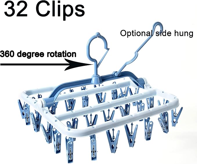 Clothes Drying Racks Foldable Clip Hangers Drip Hanger Plastic with 32 Drying Clips Wind-Proof Hook Underwear Hanger for Socks Bras (Blue)
