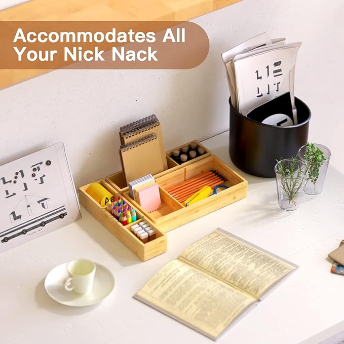 - NICE WOOD JUNK DRAWER ORGANIZER :Our bamboo drawer storage and organizer box worked so well to get silverware drawer organized. You will love how sturdy and durable the bamboo is. The box smell and feel smooth,and this set has 6 pieces with adjustable dividers . You place them in so many different configurations, which made them easy to fit into drawer.