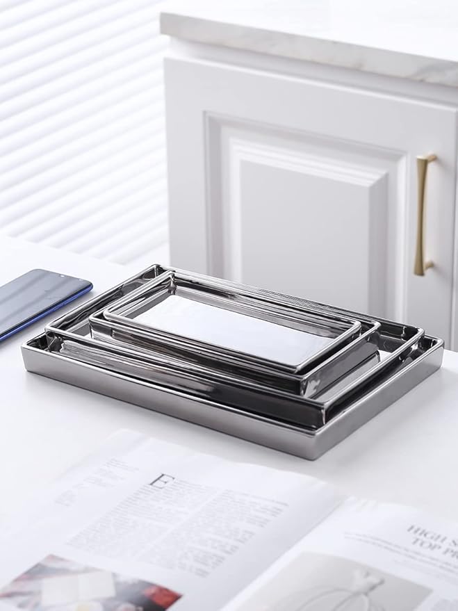 Jewelry Holder Ceramic Trinket Tray Rectangte Vanity Makeup Mirror Tray Silvery Small