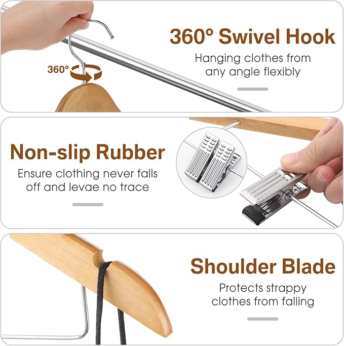 - Adjustable and Flexible: in view of your usage requirements, these wooden pants hangers have thoughtful designs, coming with 360 degree swivel hooks at the top and adjustable metal clips that can be moved to fit different sizes of clothes, meeting your various needs of hanging in your wardrobes