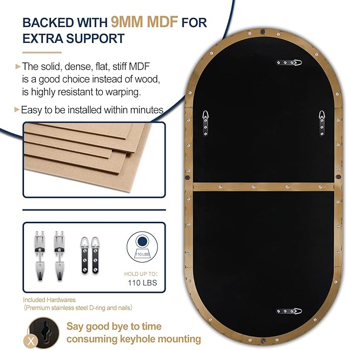 - Easy Hanging: Our brass oval mirror comes with four pre-installed reinforced D-ring hooks along with all other hardware for easy installation. However, this is a heavy and large mirror, so it is recommended that two people work together for installation