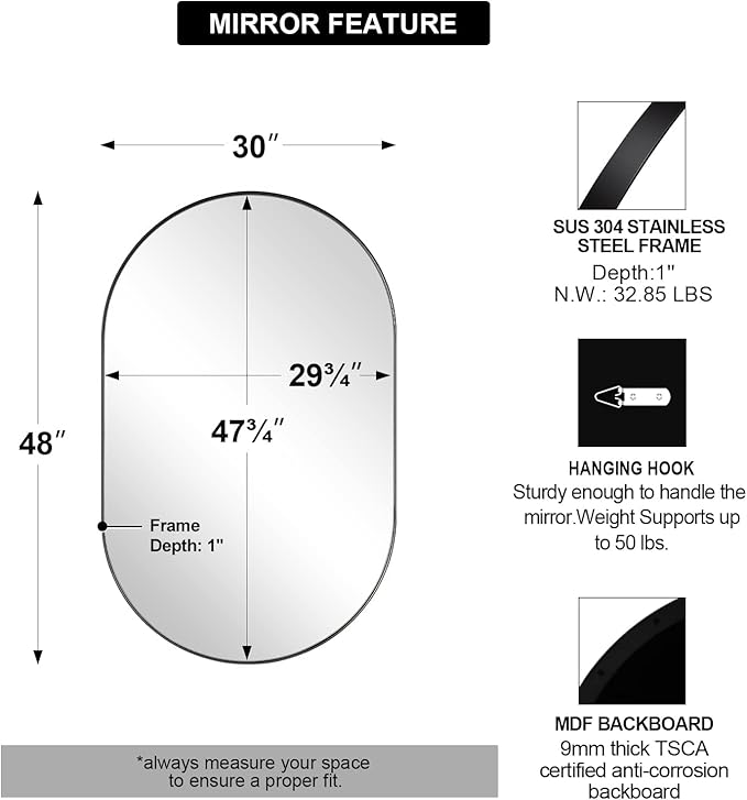 - Modern Elongated Design : Add simple sophistication to any room with our 30x48 inch bathroom mirror. The pill-shaped design in matte black color will soften your space with its gorgeous look
