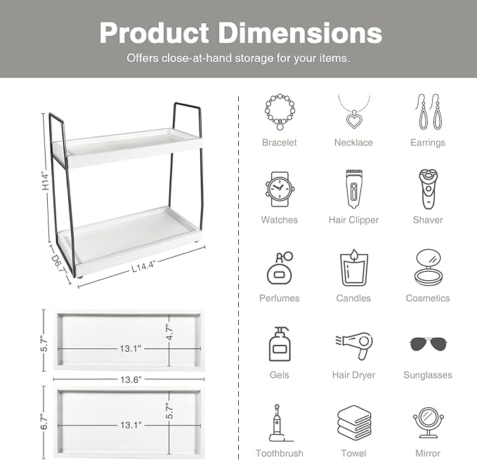 - Versatile Countertop Organizer - This 2 tier countertop organizer are useful organization tools to declutter counters in your bathroom, makeup room, vanity room, powder room, kitchen, coffee bar, etc. The bathroom shelf organizer countertop can even be placed under the sink to organize messy items.