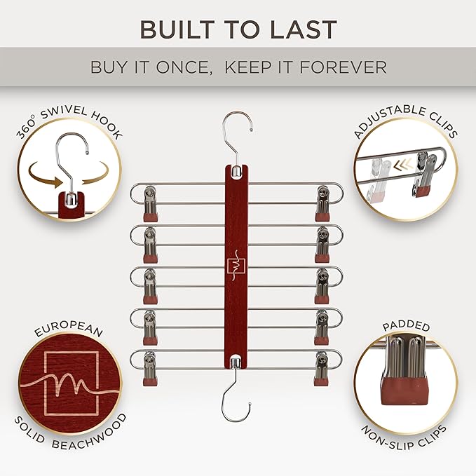 - BUILT STRONG to SECURELY HOLD YOUR CLOTHES - Each of our space saving hangers for clothes are made from premium European beechwood with steel hardware to support up to 30lbs. The multi skirt hangers space saving easy grip clips are non slip to securely hold & support your clothes.