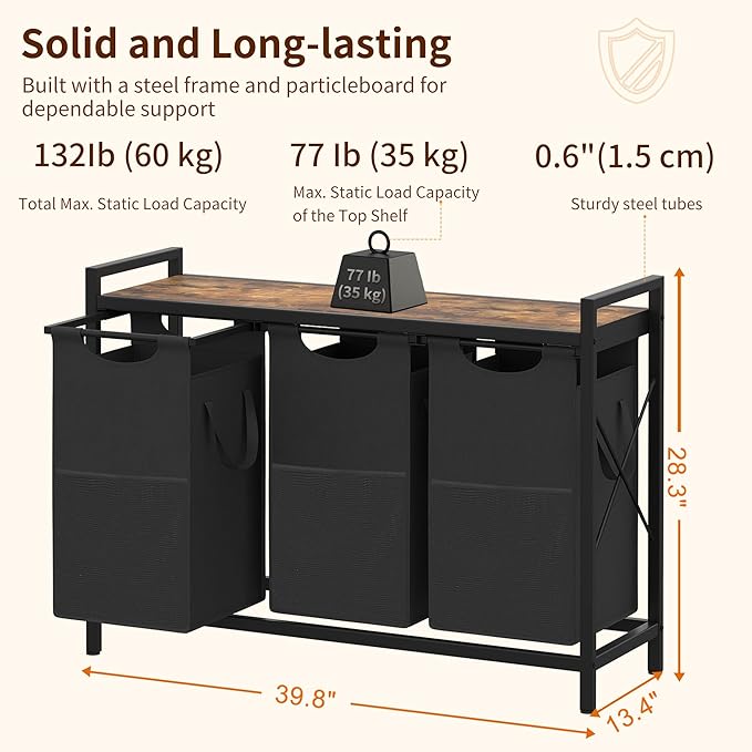 - Great Laundry Organizer! The laundry sorter with 3 bags and 1 shelf, convenient for clothes and handy for detergent. Aesthetic appearance of the laundry baskets makes it become a beautiful way to declutter the laundry room and a good addition to Bedroom, Bathroom or Dorm